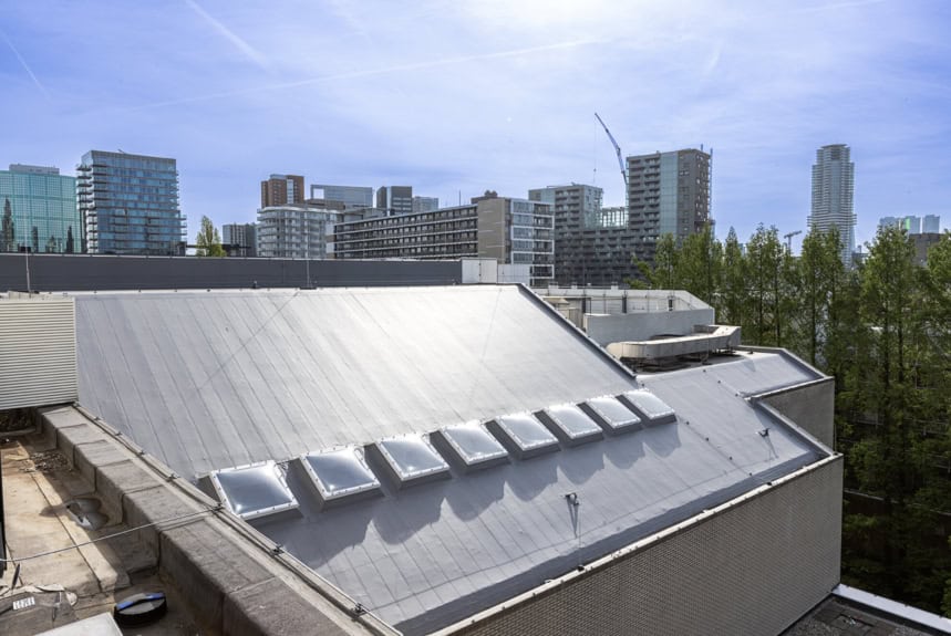 Es besteht aus zehn unterschiedlichen Dachflächen, von denen ein Teil in ein Gründach umgewandelt wurde, während ein anderer Teil mit Solarmodulen ausgestattet ist. Auch die Anpassungen am Regenwasser-Entwässerungssystem, sowohl oberhalb als auch unterhalb des Dachs, gehören zu unserem Leistungsumfang. Darüber hinaus wurde die bestehende Absturzsicherung angepasst und bei Bedarf in Teilen ersetzt oder erweitert, um den aktuellen Sicherheitsstandards zu entsprechen.