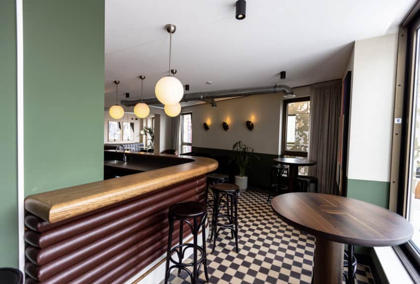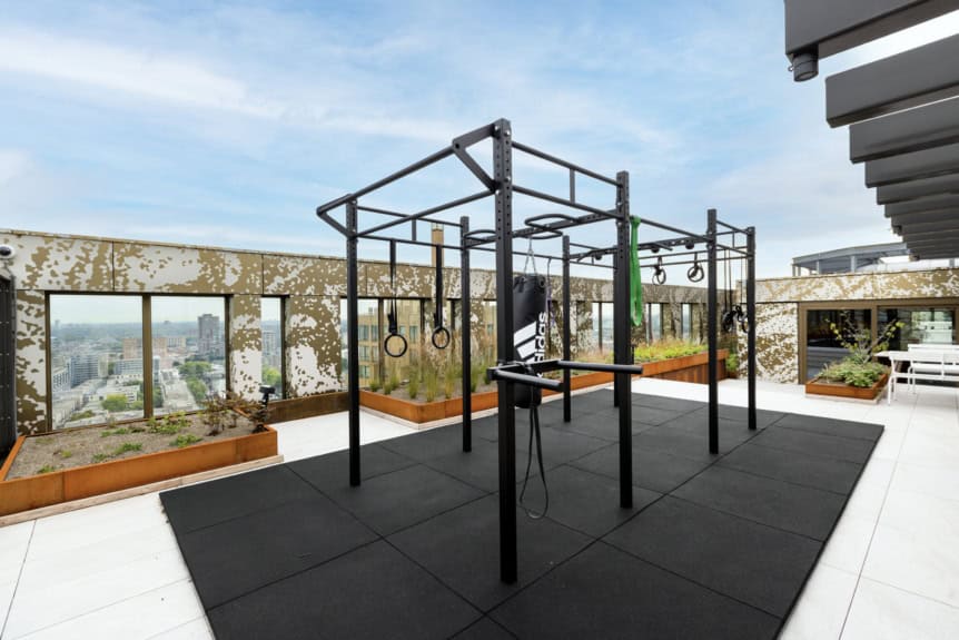 On the roof of the student building, 70 meters high, a rooftop gym and skylounge have been created, connecting to a 600 m² roof terrace with panoramic views over the Rotterdam skyline. The elevated terrace is built on 80 cm high pedestal supports to conceal all channels. The raised corten steel planters with green vegetation give the terrace a robust appearance.